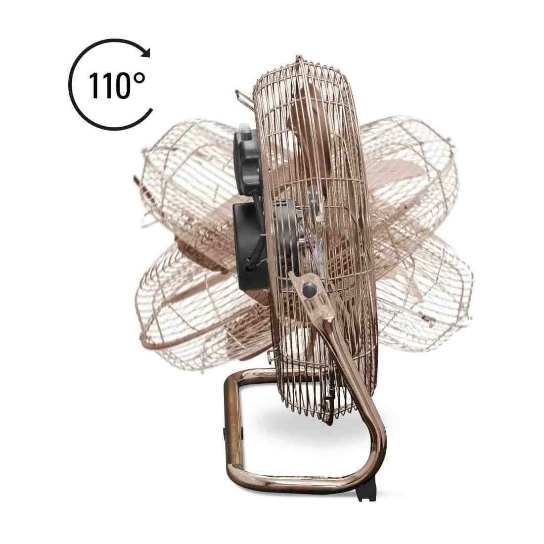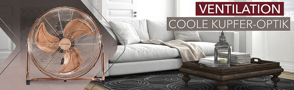 Quạt sàn Trotec TVM 17 thuyết phục với hệ thống quang học bằng đồng thời trang và công suất mạnh 100 watt, có thể được điều chỉnh theo ba mức tốc độ.