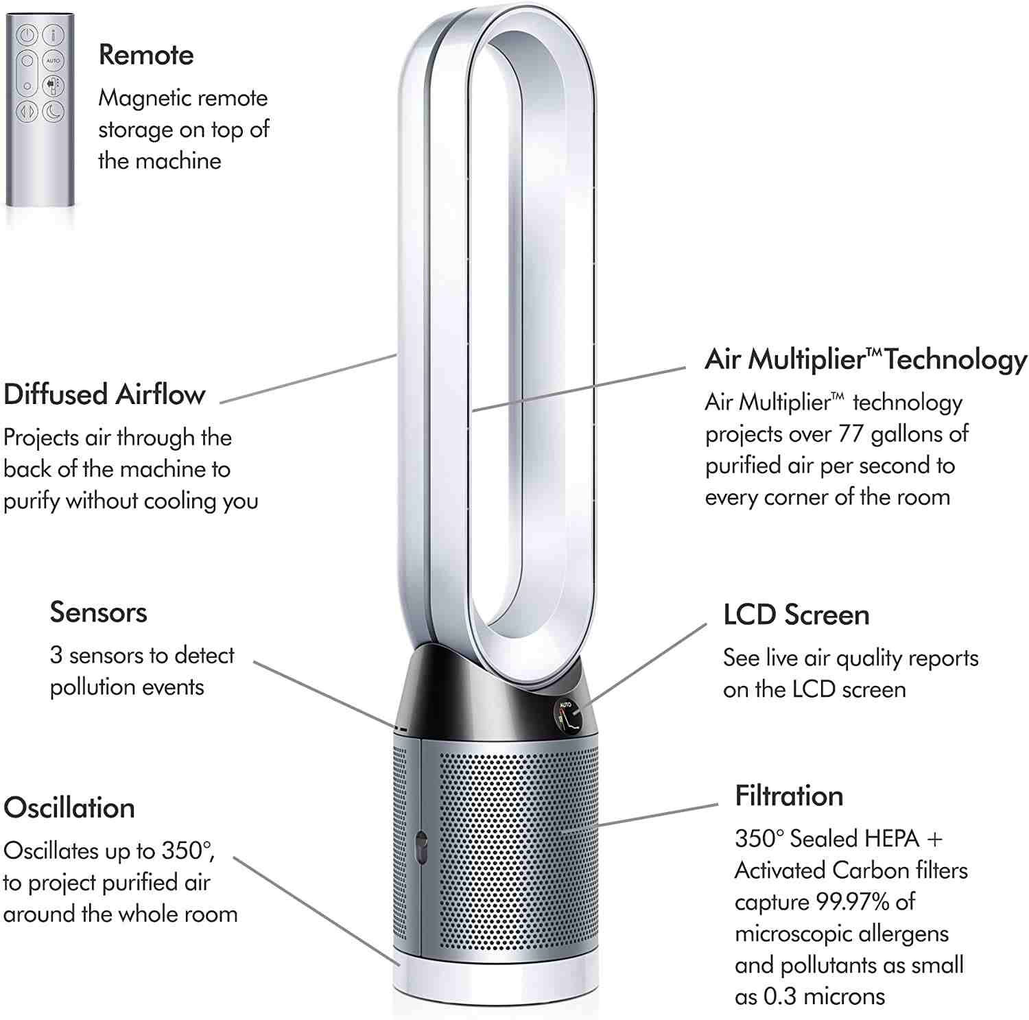 Dyson là thương hiệu nổi tiếng thế giới về chất lượng & thiết kế đẹp mắt. Các sản phẩm của Dyson được nghiên cứu, phát triển & thiết kế tại Anh, sản xuất tại Malaysia. DYSON PURE COOL với hai nhiệm vụ chính là lọc không khí và quạt gió, tức là người dùng có thể dùng nó để làm sạch không khí và đồng thời dùng làm quạt. Ở chế độ máy lọc không khí, nó có thể loại bỏ những vật thể nhỏ nhất như lông thú nuôi, bụi hay phấn hoa trong phòng vốn ảnh hưởng xấu tới đường hô hấp.