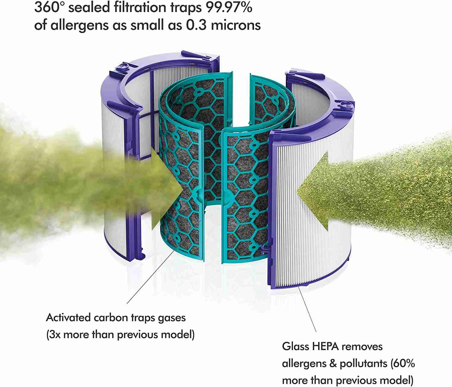 PURE COOL có bộ lọc gồm lõi than hoạt tính & GlassHEPA để loại bỏ những thành phần độc hại và đem không khí sạch trở lại căn phòng. Với khả năng lọc bụi siêu mịn (PM 0.1), máy lọc không khí Dyson Pure Cool xoá tan ô nhiễm, đem đến môi trường trong lành cho gia đình bạn. Với ứng dụng trên nền tảng Android và iOS, quạt theo dõi chất lượng không khí trong phòng và sử dụng dữ liệu đó để điều chỉnh luồng khí nhằm loại bỏ ô nhiễm. Ngoài ra, Dyson cũng hợp tác với BreezoMeter để giúp người dùng so sánh chất lượng không khí, nhiệt độ, độ ẩm trong phòng với dữ liệu từ đối tác đó. Nó cũng sẽ cảnh báo nếu như không khí trở nên quá ô nhiễm bên trong phòng chúng ta. Dữ liệu được truyền live hiển thị qua màn hình trên thân máy, cho thấy tình hình chất lượng không khí thực tế, rất dễ dàng theo dõi.